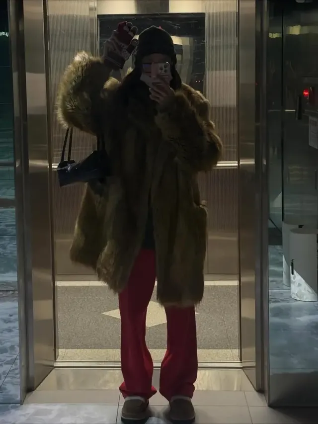 엘리베이터 거울 앞에서 포착된 첫 번째 이미지는 겨울 스타일링에서 ‘볼륨’이 어떻게 전략적으로 작동하는지를 명확히 보여준다. 손나은은 브라운 톤의 퍼 코트를 중심으로 스타일의 중심축을 설정하고, 하의는 레드 컬러 팬츠로 강한 대비를 형성하며 시선을 하체로 자연스럽게 분산시킨다. 퍼 특유의 풍성한 텍스처는 상체의 볼륨을 극대화하지만, 길이를 무릎 위로 설정해 체형을 압도하지 않도록 조율한 점이 핵심이다. 여기에 비니와 장갑, 플랫한 슈즈를 더해 과도한 글래머 대신 스트리트 감각으로 균형을 맞추며, 겨울 퍼 스타일링의 현실적인 해석을 제시한다.