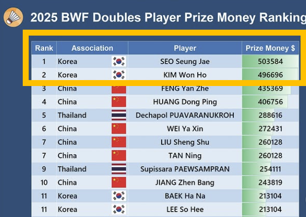배드민턴 소식을 전하는 매체 '배드민턴 랭크스'는 27일(한국시간) 사회관계망서비스(SNS)를 통해 2025년 세계배드민턴연맹(BWF) 복식 선수들의 상금 순위 톱 100을 공개했다.