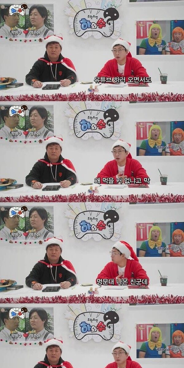 박명수는 정준하 에피소드를 얘기하며 "준하가 유튜브 촬영을 하러 와서 PD에게 '왜 먹을 게 없냐'고 하더라. PD가 명문대 나온 친구인데, '아이씨' 하면서 햄버거를 사러 갔다"고 말했다.