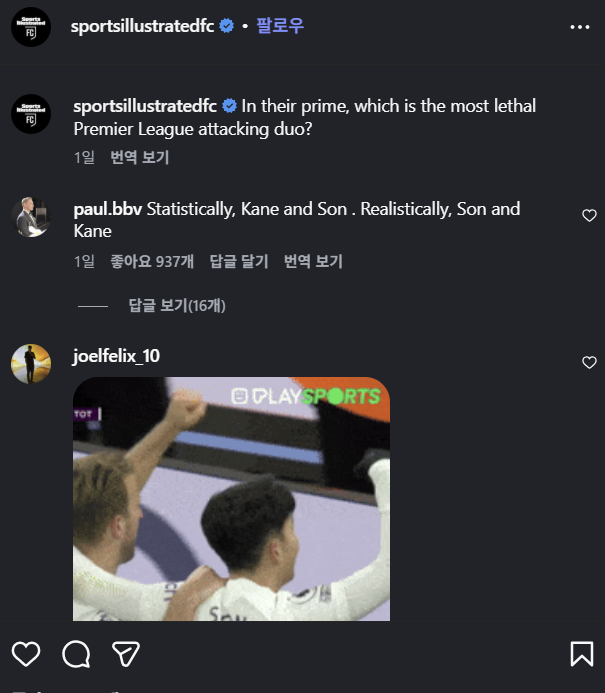 팬들은 이 질문에 손흥민과 케인 콤비를 가장 먼저 떠올렸다. "손흥민과 케인이 없었다면 토트넘은 강등 당했어도 이상하지 않은 스쿼드였다", "저 명단에서 유일하게 우승컵이 없는 듀오", "기록은 손흥민과 케인이 최고" 등 무수한 댓글로 '손케 콤비'를 추억하고 있다.