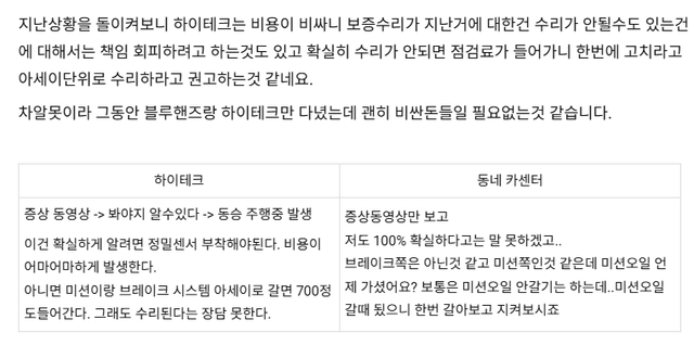 근본적인 해결책으로 하이테크 센터가 제시한 것은 미션과 브레이크 시스템을 통째로 교체하는 방식이었는데, 700만 원을 들여 교체하더라도 문제를 완전히 해결하는 건 보장은 할 수 없다는 것이다.
