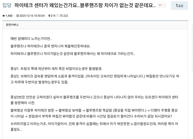 차주는 두 차례 블루핸즈를 찾았지만 “증상이 재현되지 않는다”라는 이유로 원인 규명에 실패했고, 하이테크 센터 방문을 권유받았다. 블랙박스 영상까지 지참하고 하이테크 센터를 방문했지만, 큰 차이가 없었다고 한다.