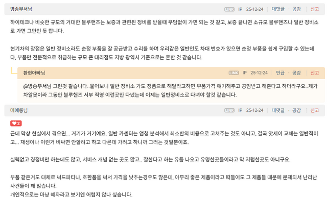 문제는 이런 접근 방식이 이 차주의 사례만은 아니라는 것이다. 유사한 사례를 제시한 현대차 차주들이 너도나도 댓글에 동일한 경험을 공유했다. 이들은 고급 시설과 제조사 권한을 갖춘 하이테크 센터라고 하더라도 정작 고장 원인을 찾아내는 능력은 정비사 개인의 역량에 크게 좌우된다고 주장했다.
