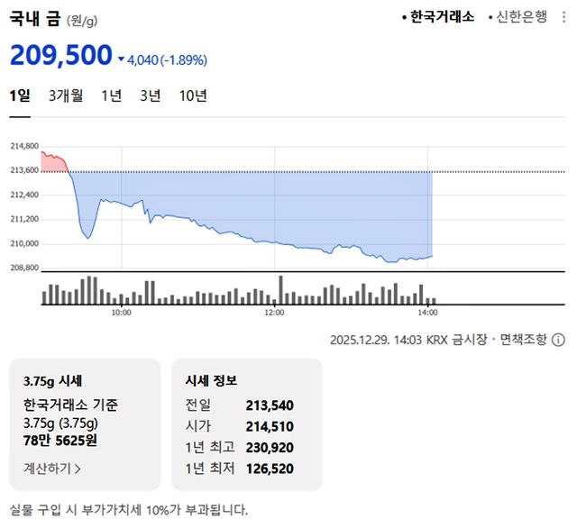 국내 금시세(금값)가 29일(이하 한국 시각) 오후 하락세(전 거래일 대비)를 보이고 있다.