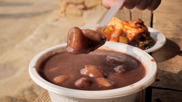 새알심을 듬뿍 넣어 끓이는 것이 이 마을의 방식. 어머님들은 둘러앉아 새알심을 빚으며 자연스레 안부를 나누고 웃음을 보탠다.