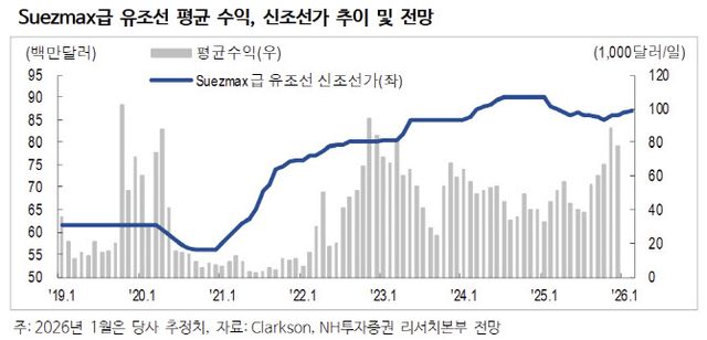 이어 “고운임으로 신조선 문의 증가 및 신조선가가 상승세다. Suezmax 유조선 신조선가는 2025년 10월 8500만달러에서 8700만달러까지 상승했다. 2026년에는 8900만달러까지 상승할 전망”이라며 “2025년 대한조선은 10억달러를 수주했다. 2026년 초 유조선 중심의 추가 수주가 예상된다. 추가 수주가 완료되면 2028년 인도 슬롯까지 대부분 소진될 전망”이라고 내다봤다.
