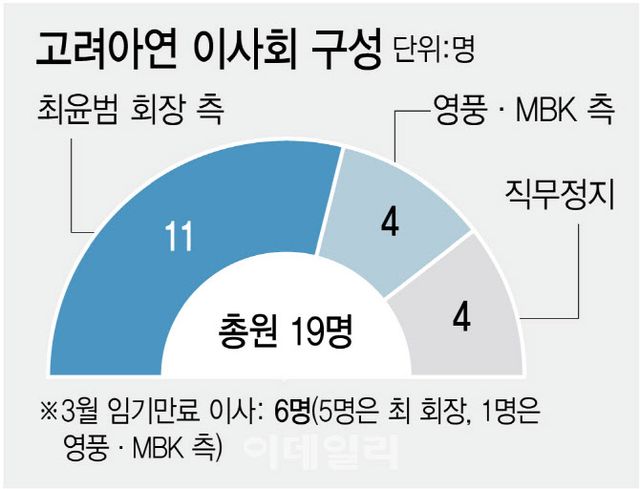 30일 업계에 따르면 내년 3월 정기 주주총회에서는 최윤범 고려아연 회장 측이 이사회 주도권을 이어갈 수 있을 것으로 전망된다. 현재 이사회는 총 19명(직무정지 4명 포함) 중 최 회장 측 11명, 영풍·MBK 측 4명으로 구성돼 있다. 이중 내년 3월 임기가 만료되는 이사는 총 6명으로, 이 중 5명은 최 회장 측 인물로 분류된다.