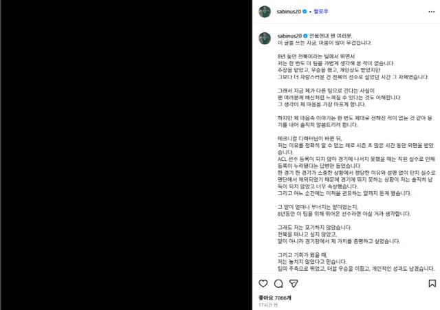 홍정호는 1일 자신의 인스타그램에 검은 배경 이미지와 함께 장문의 입장문을 게시했다. 그는 “팀의 주축으로 뛰며 더블 우승을 이뤘고, 개인적으로도 베스트11에 선정됐지만 시즌 종료를 앞두고 구단으로부터 재계약과 관련한 설명이나 논의를 받지 못했다”고 했다.