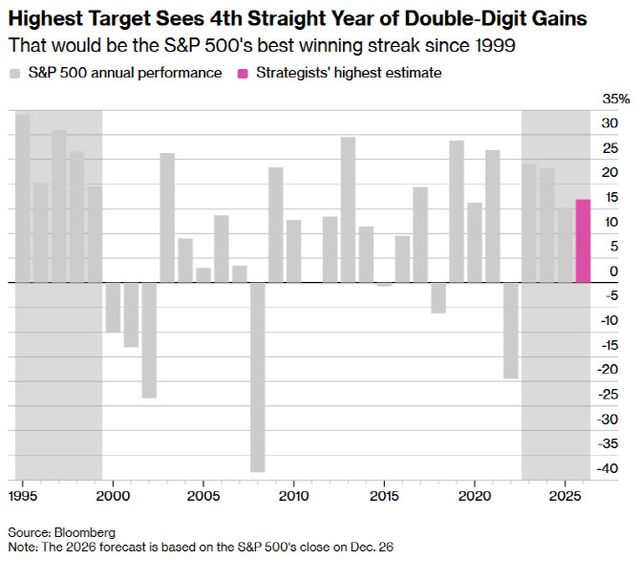 1일(현지시간) 블룸버그통신 등에 따르면 월가 21개 투자사의 S&P500 지수 올해 말 목표치 평균은 ‘2025년 말 대비 10% 상승’을 가리키고 있다. 지수는 2023년 24%, 2024년 23% 오른 데 이어 지난해에도 16% 이상 상승하며 3년 연속 두자릿수 수익률을 기록 중이다.