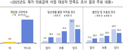 보건복지부가 최근 시행한 재가 의료급여 사업 만족도 조사 결과, 퇴원 후 재가생활에 만족한다고 응답한 비율이 93.6%였고, 95.3%는 재입원 의사가 없다고 답했다.