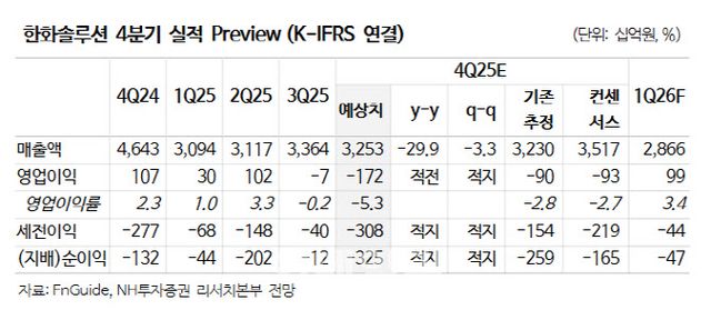최영광 NH투자증권 연구원은 “2026년 영업이익 전망치를 기존 대비 11.1% 하향했는데, 석유화학 스프레드 약세를 반영해 케미칼 사업부 실적 전망치를 하향했고, 카터스빌 신규 셀 설비 가동 차질이 길어질 것으로 예상해 신재생에너지 사업부 실적 전망치를 하향했기 때문”이라고 설명했다.