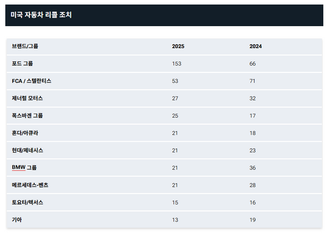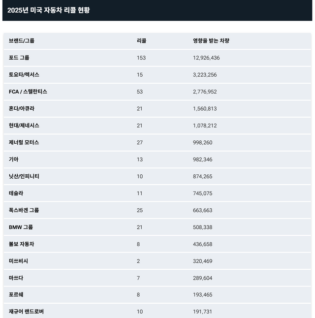 이번 집계는 2025년 12월 31일 기준 데이터라는 점도 고려해야 한다. 미 도로교통안전국 공개 자료에는 시차가 있어, 연말 마지막 약 12일간의 리콜 정보는 아직 반영되지 않았다. 이 구간이 추가되면 전체 리콜 규모는 더 늘어날 가능성도 있다. 향후 전체 데이터가 공개되면 딜러 방문이 필요한 리콜과 OTA로 해결된 리콜의 비중을 구분한 분석도 가능해질 것이다.