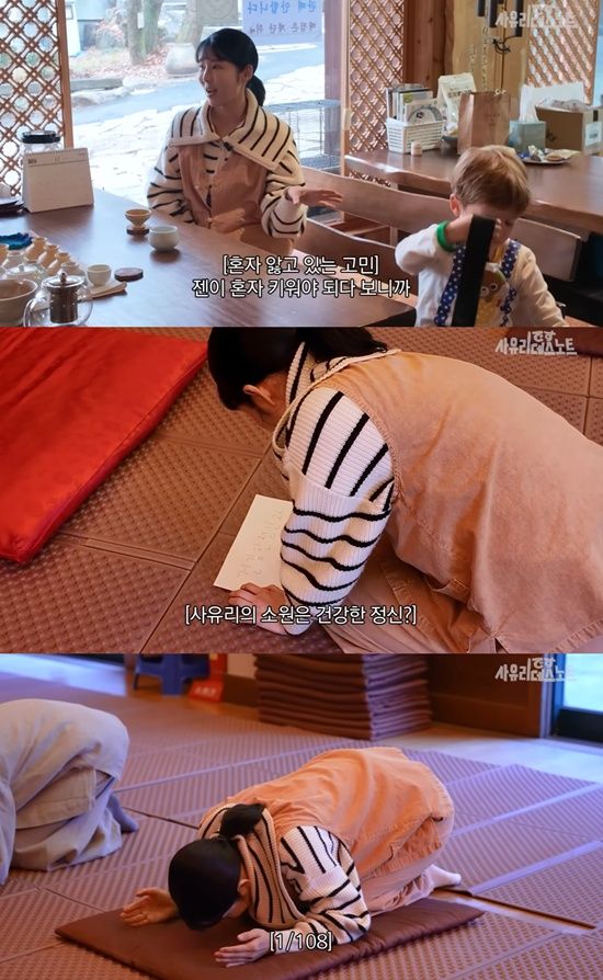 이어 사유리는 108배를 하기 위해 법당으로 향했다. 108배를 올리기 전, 그는 소원으로 '건강한 정신과 구독자 60만 명'을 적었다.