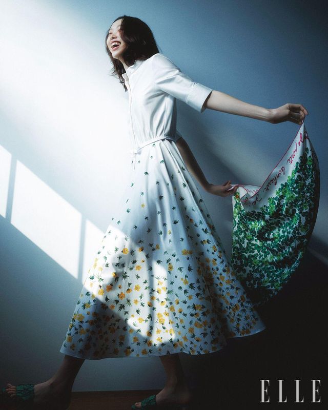 플라워 패턴의 셔츠 드레스와 클로버 뮬, 데이지 모티프의 링, 클로버 프린트 스퀘어 스카프는 모두 Dior.
