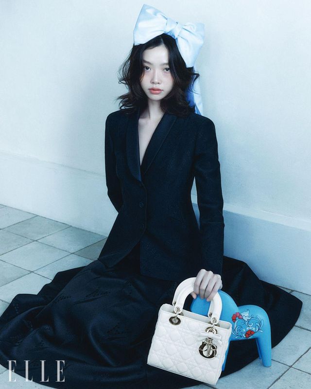 재킷과 스커트, 보 장식의 까나주 스티치 디테일의 백, 데이지 링은 모두 Dior.