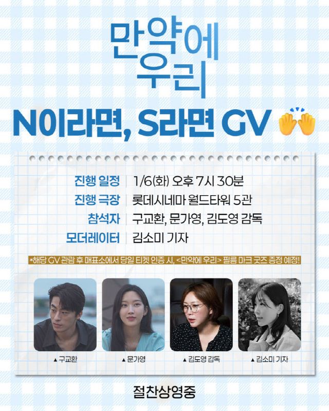 거침없는 입소문을 입증하고 있는 영화 ‘만약에 우리’가 관객들과의 공감대를 넓힐 이벤트를 준비했다. 이번 ‘N이라면, S라면 GV’는 MBTI N과 S 성향의 차이가 드러나는 ‘만약’이라는 키워드를 주제로 관객들이 배우, 감독과 질문을 주고 받으며 쌍방향으로 소통할 수 있는 자리가 될 예정이다. 구교환, 문가영, 김도영 감독이 참석하고 씨네21 김소미 기자가 진행을 맡은 이번 GV는 롯데시네마 홈페이지 및 애플리케이션을 통해 예매 가능하다.