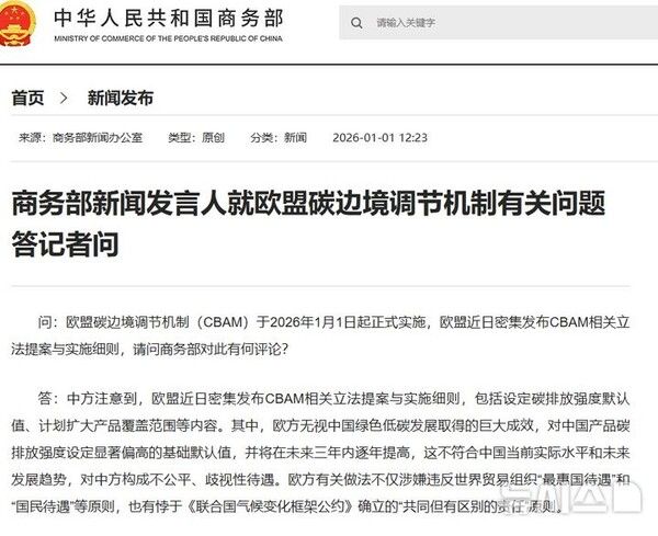 상무부는 "EU는 역사적 배출 책임, 국가 발전 단계, 기술 수준을 외면한 채, '탄소 누출 방지'라는 기후 명분을 내세워 새로운 무역보호주의를 추진하고, 자국의 탄소 기준을 개발도상국에 강요하고 있다"고도 주장했다.