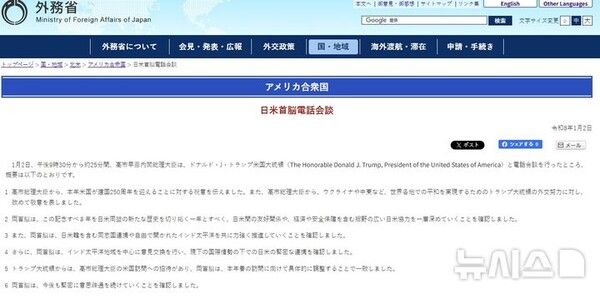 뉴시스 보도에 따르면, 일본 외무성에 따르면 트럼프 대통령과 다카이치 총리는 2일 오후 9시30분부터 25분간 전화 회담을 했다. 다카이치 총리는 이번 통화에서 미국 건국 250주년을 축하했고 우크라이나와 중동 등 세계 각지의 평화를 실현하기 위한 트럼프 대통령의 외교 노력에 대해 경의를 표했다.