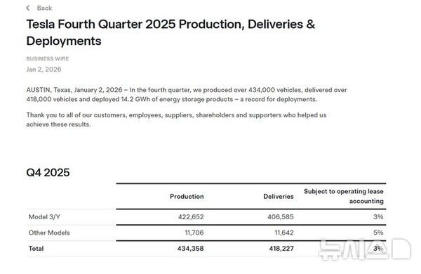 뉴시스 보도에 따르면, 테슬라는 2일(현지시간) 홈페이지에 공개한 '2025년 4분기 생산·인도 현황 자료'에서 지난해 연간 총 인도량이 164만대로 전년 179만대 대비 8.6% 감소했다고 밝혔다. CNBC에 따르면 테슬라의 연간 총 차량 인도량은 2년 연속 감소했다.