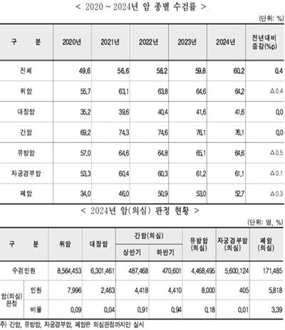 ◆암검진 수검률 60.2%, 꾸준한 상승세…간암 최고