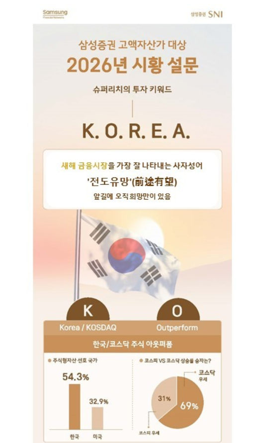 이번 설문에서 국내 초고액 자산가들은 "2026년 금융시장을 바라보며 국내 주식시장의 강력한 부활과 함께 공격적인 자산 증식의 기회로 삼겠다는 의지를 내비쳤다"고 삼성증권은 분석했다.
