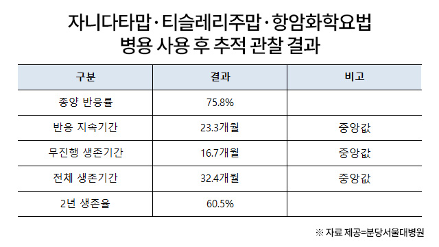 그 결과, 전체 환자의 75.8%에서 종양 크기 감소가 관찰됐다. 무진행 생존 기간 중앙값은 16.7개월, 전체 생존 기간 중앙값은 32.4개월로 나타났으며, 2년 생존율은 60.5%로 집계됐다. 일부 환자에게서는 치료 반응이 장기간 유지되는 양상도 확인됐다.
