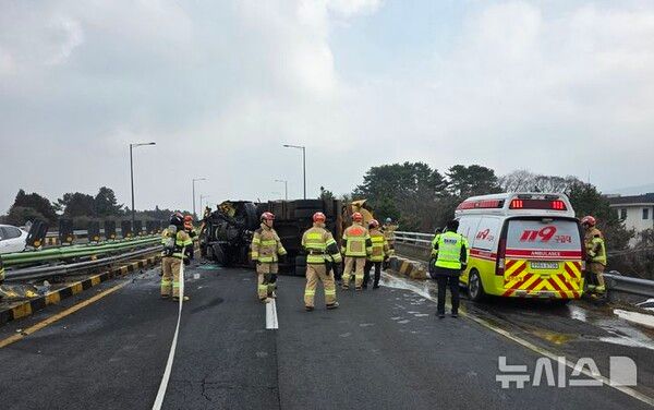 뉴시스 보도에 따르면, 10일 제주도소방안전본부에 따르면 이날 오전 10시57분께 제주시 애월읍 소길리 인근 평화로 도로상에서 음식물쓰레기 처리 차량이 중앙분리대를 들이받았다는 신고가 접수됐다.