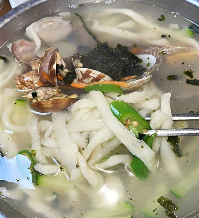 국물은 자극적인 조미료의 맛 대신 바지락에서 우러난 천연의 감칠맛에 집중했다. 통통하게 살이 오른 신선한 바지락이 그릇 바닥까지 푸짐하게 깔려 있으며, 애호박과 김가루, 그리고 알싸한 청양고추가 더해져 은은하면서도 시원한 뒷맛을 완성한다. 특히 1인 1메뉴 주문 시 칼국수 사리를 무료로 추가할 수 있는 넉넉한 인심은 '가성비'까지 충족시키며 미식가들의 찬사를 받는다.