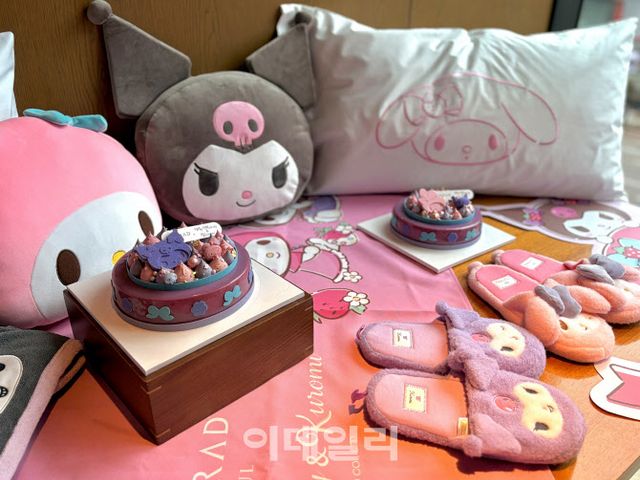 | ‘마이멜로디·쿠로미’ 플레임즈 케이크와 객실 패키지 이용객에게 제공되는 는 쿠로미 쿠션 1종과 캐릭터 슬리퍼 (사진=이민하 기자) |
