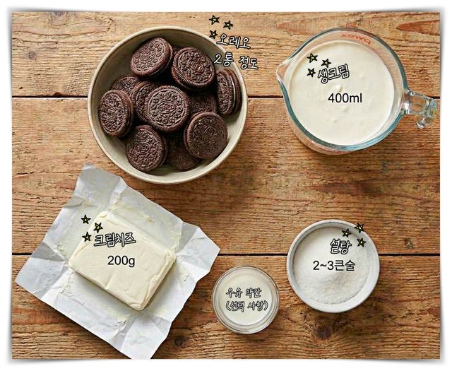 재료는 오레오 약 20개, 크림치즈 200g, 생크림 400ml, 설탕 2~3큰술이면 충분하다. 쿠키가 너무 단단한 식감이 부담되면 우유에 1~2초 정도만 살짝 적셔 사용한다. 이 과정에서 쿠키가 풀어지지 않도록 시간 조절이 중요하다.