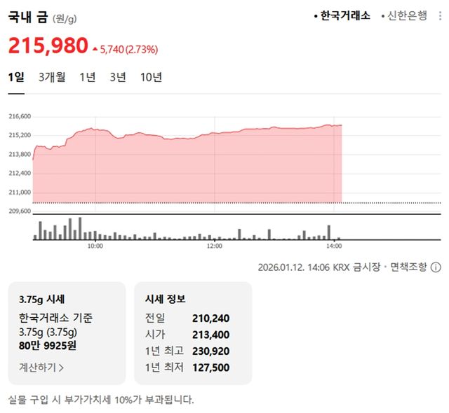 국내 금시세(금값)가 12일(한국 시각) 오후 급등세(전 거래일 대비)를 보이고 있다.