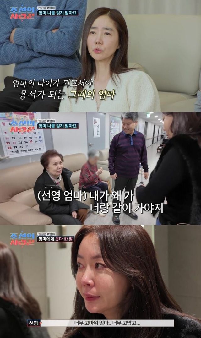 어머니를 다시 요양원으로 보내며 힘겨운 이별을 마친 안선영은 “세상에서 제일 허비하는 시간이 누군가를 미워하는 시간인데 50년을 허비했다. 엄마를 미워하느라”라고 고백했고, “너무 고마워 엄마, 지금처럼 잘 먹고 잘 자고 건강만 해. 내가 다 해줄게”라고 어머니에게 못다 한 진심을 전하며 끝내 눈물을 쏟았다.