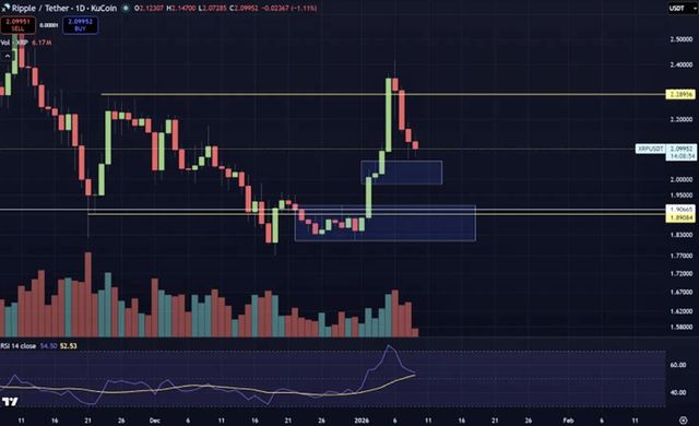 XRP의 경우 1차 지지선인 '파란색 박스'를 지킬지, 아니면 1.90~1.82달러 사이의 깊은 수요 구간으로 내려갈지가 관건이라는 게 그의 생각이다.