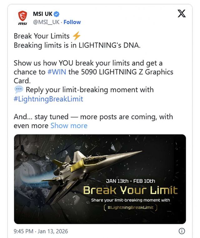 이벤트 참여 방법은 간단하다. MSI의 이벤트 게시물에 자신이 ‘한계를 깼던 경험’을 댓글로 남기고 해시태그 #LightningBreakLimit을 추가하면 된다. 예시는 개인 최고 기록 갱신, 오버클럭 도전, 성취 경험 등 무엇이든 가능하다. 이벤트 기간은 1월 13일 ~ 2월 10일, 2026년(UTC+8 기준 23:59)까지다.