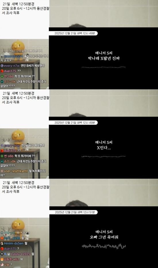 최근까지 A씨의 연인었던 B씨가 녹음한 음성 파일도 공개됐다. 음성 속 전 매니저 A씨로 보이는 인물은 경찰 조사 직후 "박나래 디스패치한테 또 연락했다. 박나래 X팔년 진짜 내가 X인다", "오빠 그X X여줘"라고 말해 충격을 안겼다.