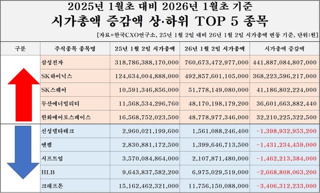 단일 주식 종목 중 가장 많이 시총이 늘어난 곳은 삼성전자였다. 작년 초 약 318조원에서 올 초 약 760조원으로 440조원 이상 증가했다. 같은 기간 SK하이닉스는 124조원에서 492조원으로 1년 새 360조원 이상 시총이 불었다.