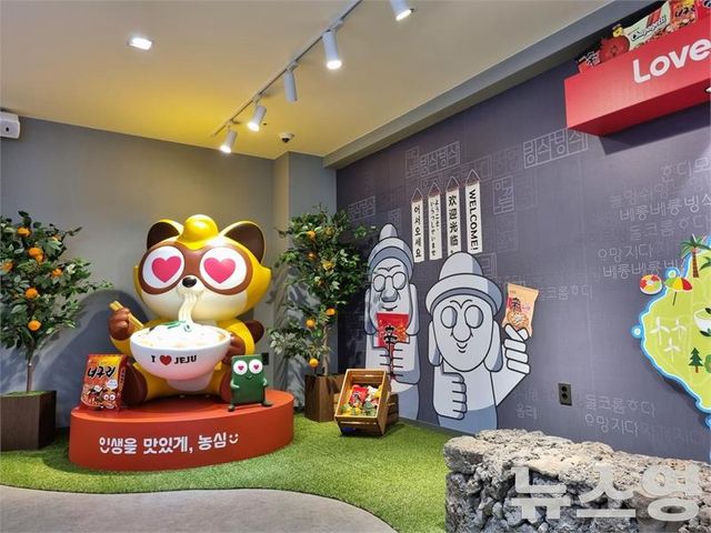 이 외에도 농심은 브랜드 경험을 극대화할 수 있는 볼거리도 마련했다. 매장 곳곳에는 대형 너구리 캐릭터와 함께 제주를 상징하는 돌하르방, 현무암 돌담, 귤나무 등을 활용한 이색 포토존으로 제주 특유의 감성을 더했다.