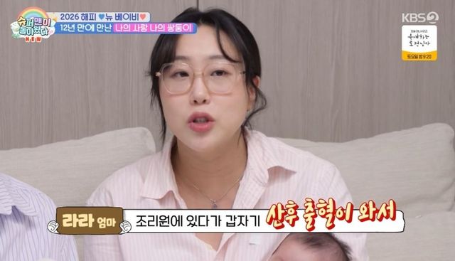이어 임라라는 “문제는 그 상태에서 출산하게 되니까 과다 출혈을 했다. 조리원에 있다가 갑자기 산후 출혈이 와서 응급실에 갔다”며 심각했던 상황을 전했다. 손민수는 “의자가 피로 다 젖었다. 그 상태로 화장실에 갔는데, 아내가 지나간 곳이 살인사건 현장처럼 피로 난리가 났다”라며 “그때까지만 해도 화장실에서 물을 틀어놓은 줄 알았는데, 피 흘리는 소리였다. 그럼 안되지만, 죽는 건가 생각이 들어서 정신이 번쩍 들었다. 바로 구급차를 불렀는데, 이동하는 과정도 힘들었다”라고 밝혔다.
