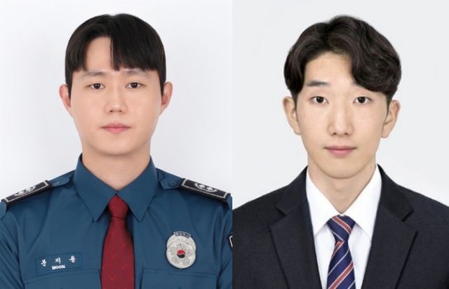 남문지구대 소속 문지용 순경(왼쪽), 중동지구대 소속 김량훈 경장. 제주경찰청 제공