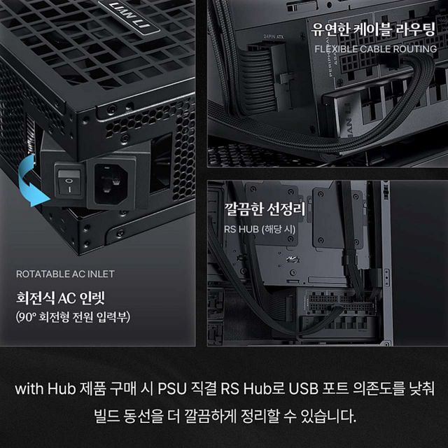 LIAN LI RS 시리즈는 전원 입력부 AC 인렛을 90도 회전할 수 있는 구조를 적용했다. 케이스 구조에 따라 전원 케이블이 꺾이거나 간섭이 생기는 상황을 줄이는 목적이다. 기본 장착과 측면 장착을 포함해 설치 방향을 바꿀 수 있는 구성을 지원한다.