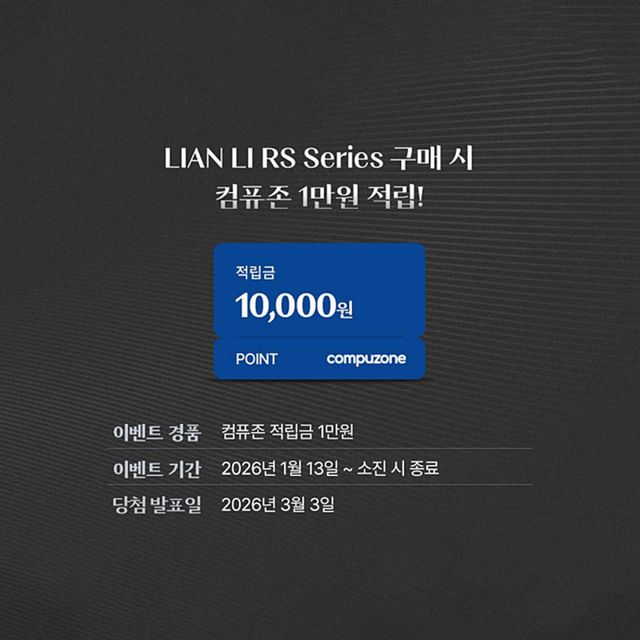 컴퓨존 적립금 제공 이벤트는 1월 13일부터 준비 수량 소진 시까지 진행된다. 당첨자 확인은 3월 3일로 안내됐다. 보증은 파워서플라이 10년, RS Hub 2년이다.
