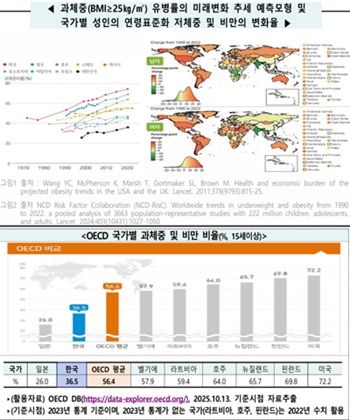 우리나라의 과체중 및 비만 비율(36.5%)은 OECD 평균(56.4%)보다 낮은 수준을 유지하고 있다. 일본(26.0%) 다음으로 낮은 수치다.