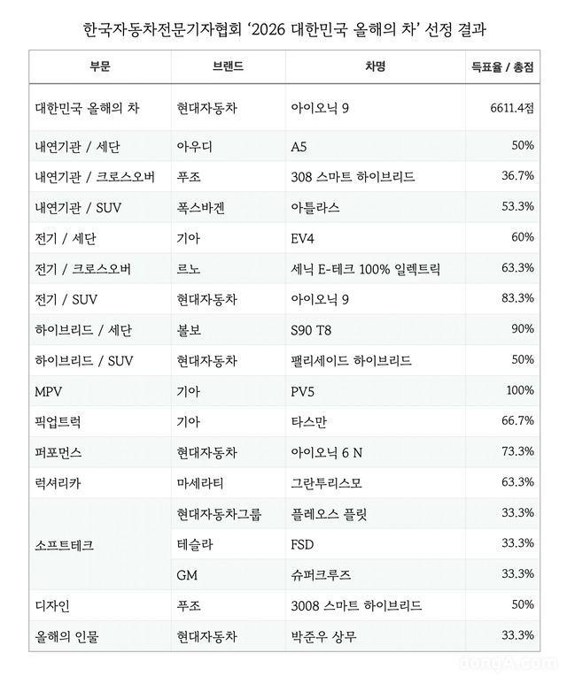 부문별 수상은 △대한민국 올해의 차 ‘현대자동차 아이오닉 9’ △올해의 내연기관 세단 ‘아우디 A5’ △올해의 내연기관 크로스오버 ‘푸조 308 스마트 하이브리드’ △올해의 내연기관 SUV ‘폭스바겐 아틀라스’ △올해의 전기 세단 ‘기아 EV4’ △올해의 전기 크로스오버 ‘르노코리아 세닉 E-테크 100% 일렉트릭’ △올해의 전기 SUV ‘현대자동차 아이오닉 9’ △올해의 하이브리드 세단 ‘볼보 S90 T8’ △올해의 MPV ‘기아 PV5’ △올해의 픽업트럭 ‘기아 타스만’ △올해의 퍼포먼스 ‘현대자동차 아이오닉 6 N’ △올해의 럭셔리카 ‘마세라티 그란투리스모’ △올해의 디자인 ‘푸조 3008 스마트 하이브리드’가 선정됐다. 올해의 인물에는 현대자동차그룹에서 N브랜드를 담당하는 박준우 상무가 선정됐다.
