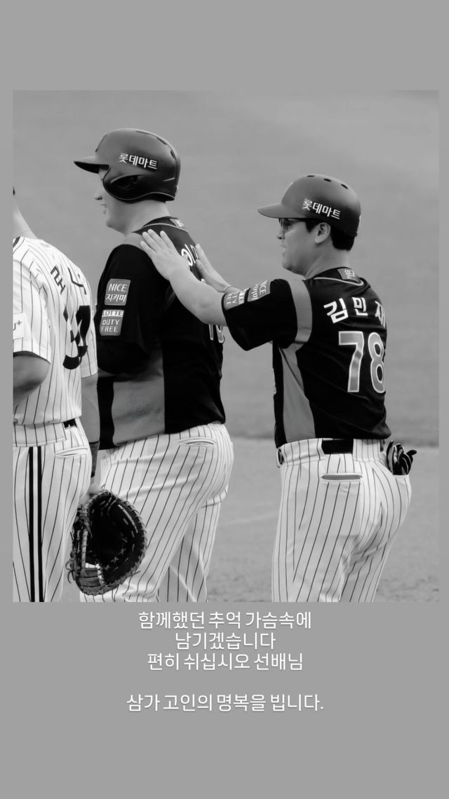 이대호는 최근 자신의 SNS(소셜미디어)를 통해 ‘함께했던 추억 가슴 속에 남기겠습니다. 편히 쉬십시오. 선배님. 삼가 고인의 명복을 빕니다’라는 메시지를 남겼다. 그러면서 한 장의 사진을 게시하며 고인과의 추억을 돌아봤다. LG와의 원정 경기에서 1루에 진루한 이대호의 등을 김 코치가 토닥이는 장면이 담긴 사진이었다. 이대호가 이빨을 보이며 환하게 웃고 있는 장면이었다.