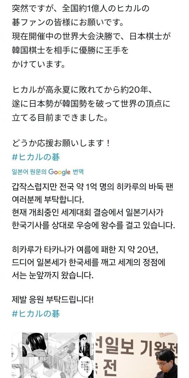 일본팬들이 히카루의 바둑(고스트 바둑왕) 주인공은 졌지만 너는 할 수 있다고 기대하면서 응원을 보냄