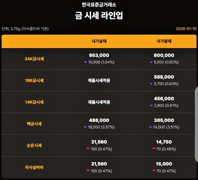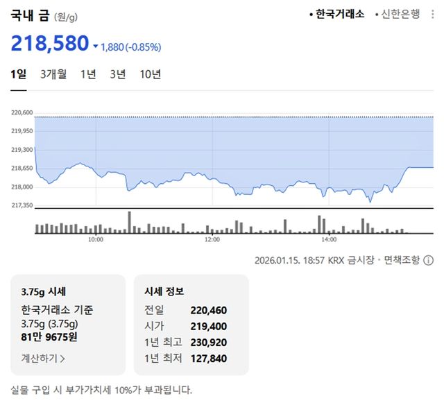 국내 금시세(금값)가 15일(한국 시각) 오후 하락세(전 거래일 대비)로 마감했다.
