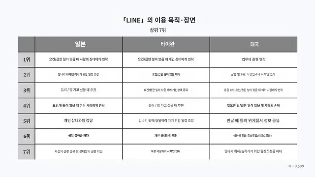 메신저 'LINE' 이용하는 주요 3국(일본/대만/태국) 비교