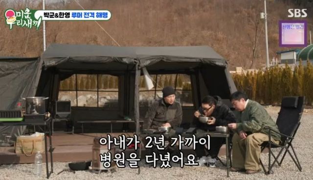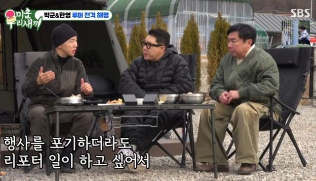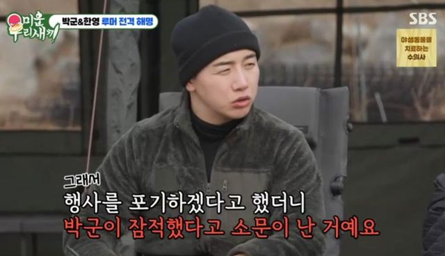 결국 이상민은 박군 한영 부부를 둘러싼 ‘이혼설’을 조심스럽게 입에 올렸고, 박군은 “일단 내가 잠적을 했다는 건 오해다. 리포터 일을 하고 있는데 한 번 촬영에 이틀씩 걸리니까 행사를 못하겠더라. 그래도 리포터 일을 하고 싶어서 행사를 포기하겠다고 한 게 와전된 것”이라고 설명했다. 현재 머물고 있는 괴산은 베이스캠프처럼 마련한 거처라고.