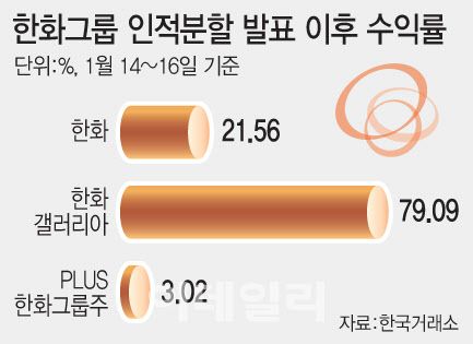 이 같은 내용이 알려지자 한화그룹의 계열사 전반으로 ‘테마’가 확산됐다. 특히 셋째 아들인 김동선 부사장이 대주주로 있는 한화갤러리아(452260)는 이틀 연속 상한가를 기록하는 등 3거래일간 79.08% 급등했다. 그룹 내 상장사를 담은 상장지수펀드(ETF) ‘PLUS 한화그룹주’의 3거래일 누적 수익률은 3.02%를 기록했다.