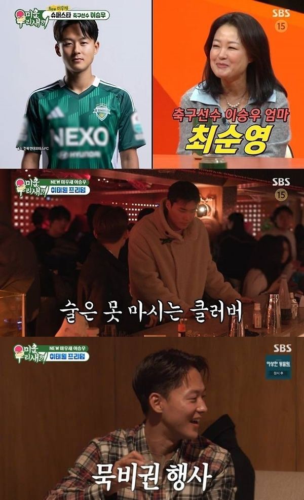뉴시스 보도에 따르면, 18일 방송한 SBS TV '미운 우리 새끼'에선 이승우가 송범근과 이태원 클럽을 찾는 모습이 그려졌다. MC 서장훈은 "이승우가 평소에도 클럽 가는 걸 좋아하느냐"고 물었고, 어머니 최순영씨는 "좋아한다"며 끄덕였다. 서장훈은 "어머니가 (클런 간 걸) 10번 알면 실제로 50번 가는 것"이라고 했다.